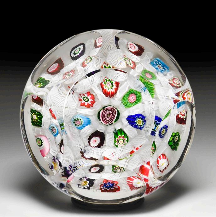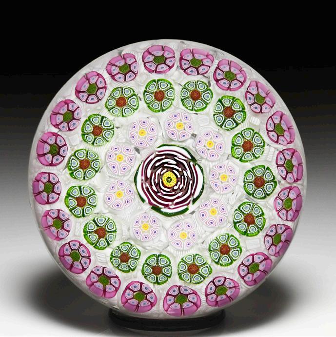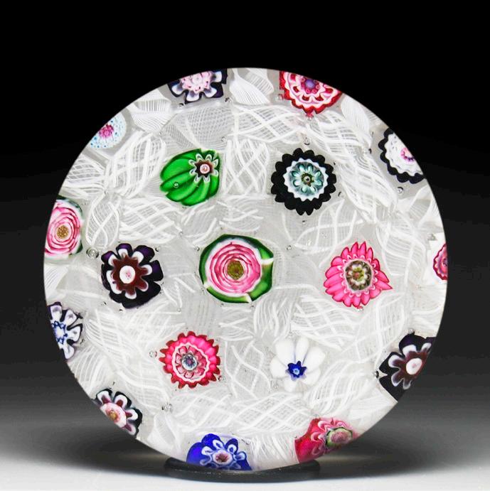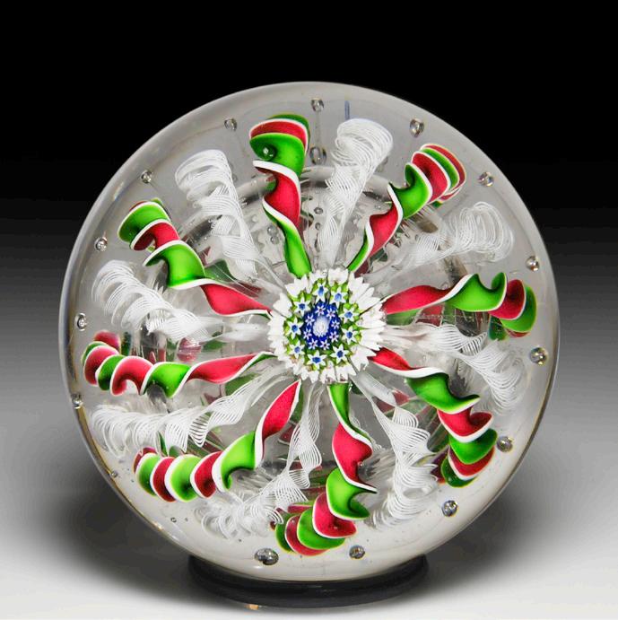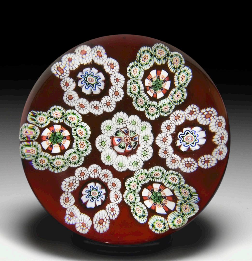 8 Rare antique Bacchus close concentric red and white millefiori paperweight. A central trio of red and white hollow ruffle canes is surrounded by a ring of white ruffle canes, a ring of red and white ruffle canes and another ring of white ruffle canes, giving the impressing of an all-white carpet ground with a few passionate red accents. An outer ring of solid white rods, each with a red six-point star at the center, is pulled downward into a sturdy stave basket for an otherwise delicate design. “Entirely apart from their rarity, their workmanship entitles them to be included in every collection of any consequence.” —1999 PCA Bulletin. Fine condition with internal flaw.