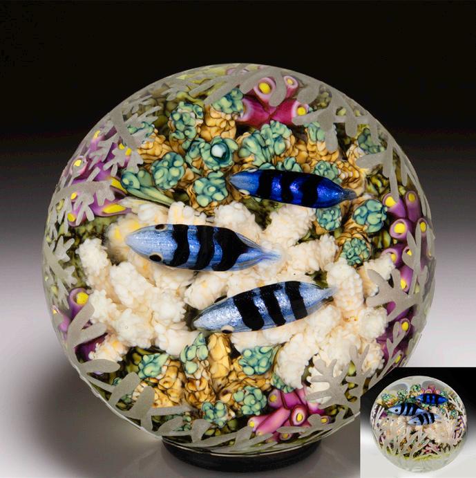 353 Jesse Taj 2004 “Clown Fish, Anemone and Jellyfish” compound paperweight. A school of fish includes murrini of two white and orange clown fish, yellow tang fish, a sea turtle and tiny fish, swirl around a pale pink sea anemone and a jellyfish. Blue and orange swirl ground. Signature/date cane.