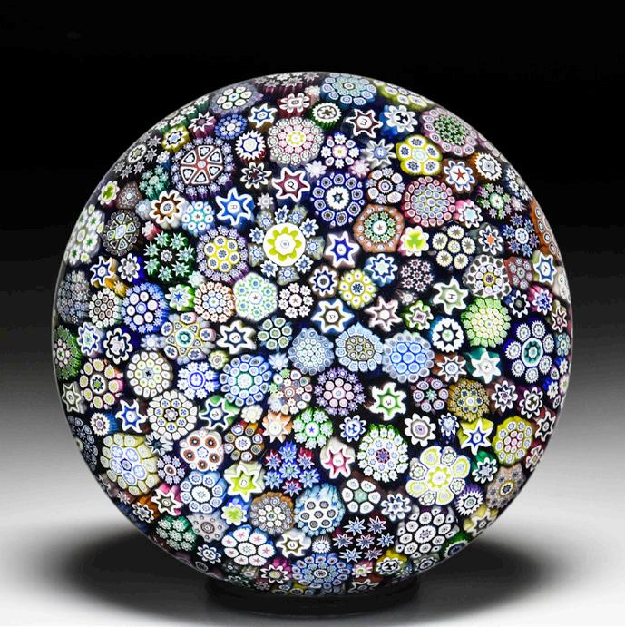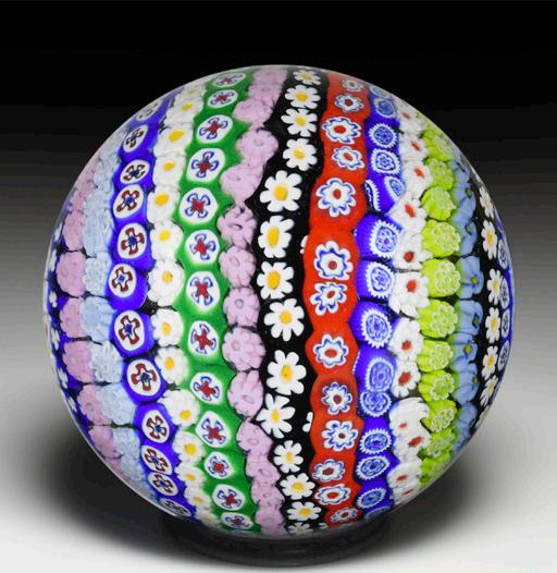 357 Venetian parallel rows millefiori paperweight. Arches of various flower canes are gathered in parallel rows into a high dome and encased in a thin layer of glass.