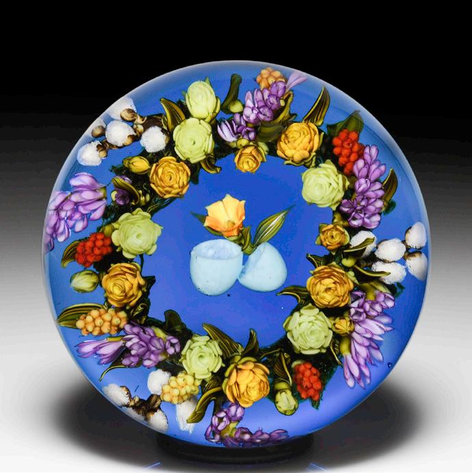 337 Perthshire Paperweights 1983 “Posy Ring” millefiori garland faceted paperweight. Five variously colored millefiori flowers alternate with pairs of green leaves on a circular green vine, atop a cushion of white upset muslin. A garland of alternating blue and yellow cogs surrounds the border. Eight side facets and two tiers of ten side facets encircle a single top facet. Limited edition of 300; 187 made. Signature/date cane. Excellent condition.