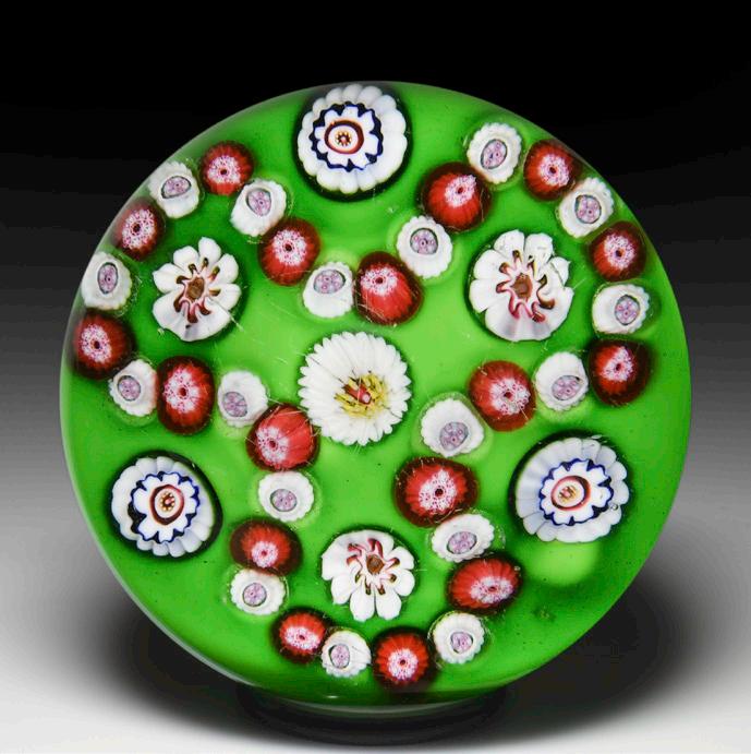 1 Very rare antique Saint Louis upright bouquet green aventurine encased overlay paperweight. A delightful flower bouquet has an upright double-tiered purple-striped red flower, with an inner tier of four petals and an outer tier of six petals around an air bubble center that conceals a tiny white cog cane, flanked by a blue and by a white three-petalled companion blossom, in alternation with complex cog cane buds, also in patriotic colors. The blooms are cupped and spaced by crenulated green leaves, studded with dewy air bubbles, which are pulled downward and gathered by the stems. The bouquet ends perfectly centered on a star-cut clear ground and is viewed through the six side facets and one top facet of an extremely rare green aventurine-over-white double overlay, all expertly encased in a layer of clear glass. “In the complicated encased overlay process, the casing, or overlay, had to be cooled in the annealing oven (lehr) before the windows could be cut. Then the weight had to be carefully reheated and covered with a further coating of clear glass, a multiple operation that must have taken days to complete” —Glass Paperweight of the New-York Historical Society, page 77. A similar example is pictured and discussed on page 90 and 152, figure 220, of Paperweights: Flowers Which Clothe the Meadows, as held in the Corning Museum of Glass collection.