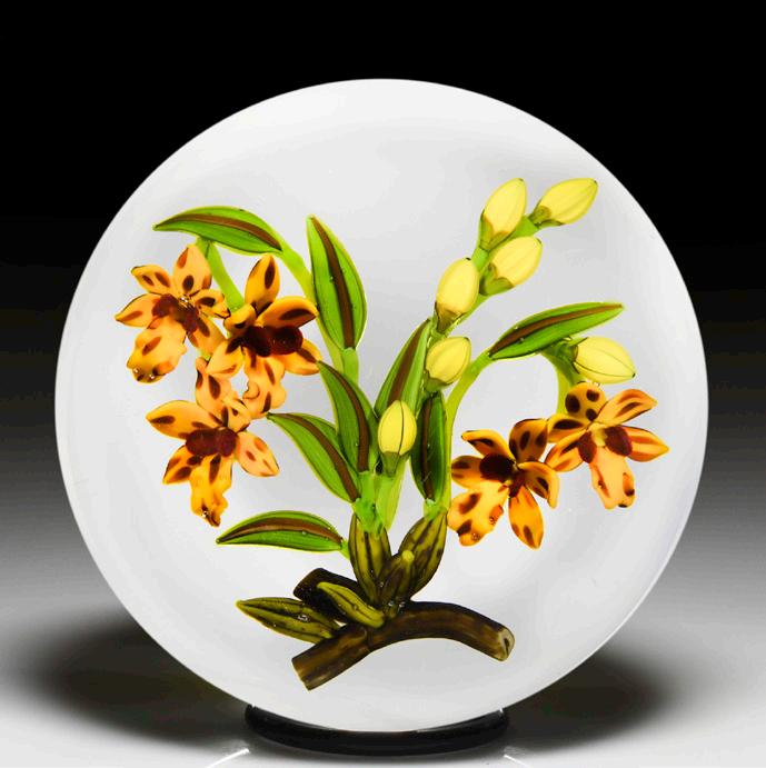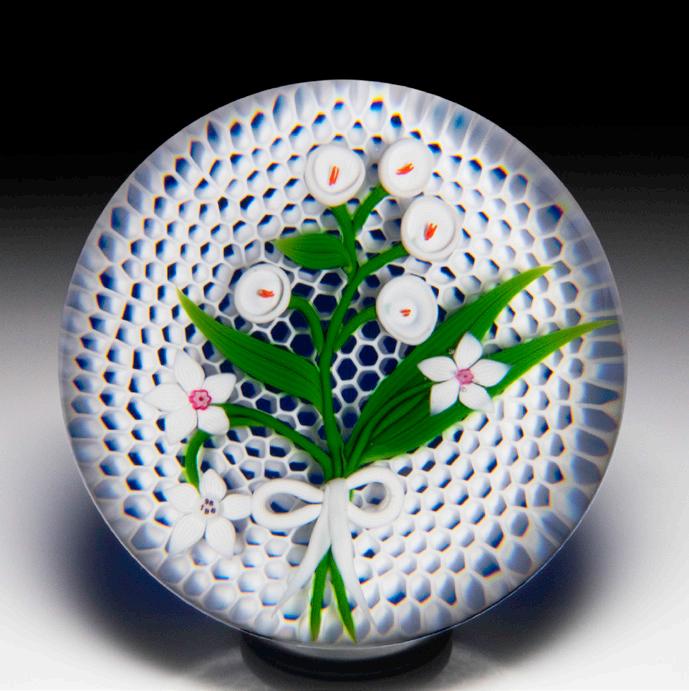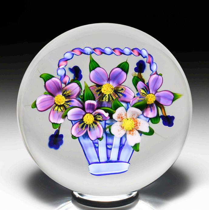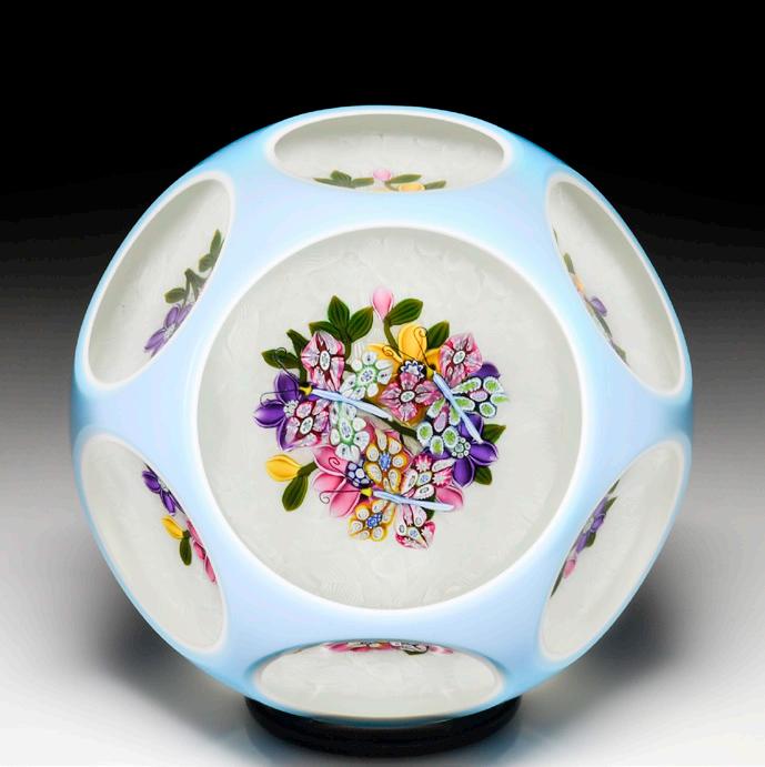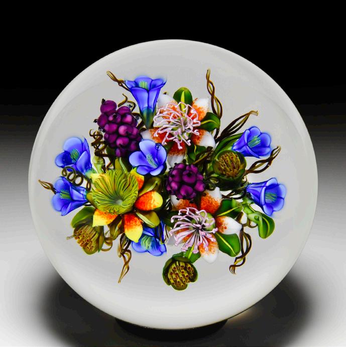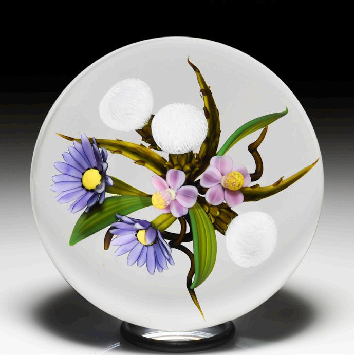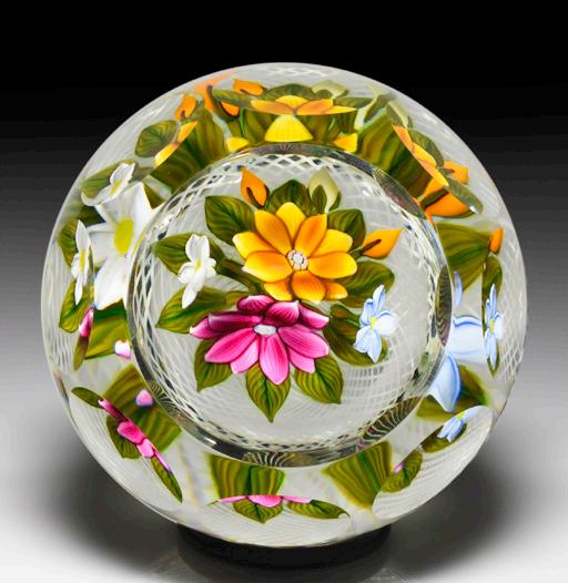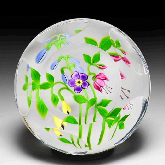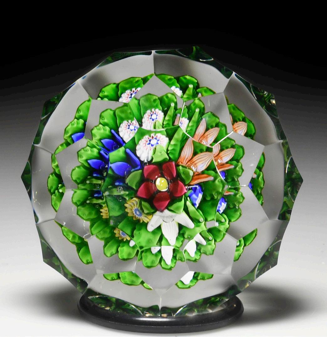 315 Perthshire Paperweights (1997) three-dimensional bouquet faceted paperweight. Two pretty clematis blooms, one orange and the other pink, are flanked by two smaller blossoms in white and sky blue and sit within a nest of veined leaves atop a swirling white latticinio cushion, three orange buds crowning the composition. Three tiers of eight side facets and one top facet. Limited edition of 200. Signed. Previously sold in the L.H. Selman Ltd. Summer 2014 57th Auction as lot 326.