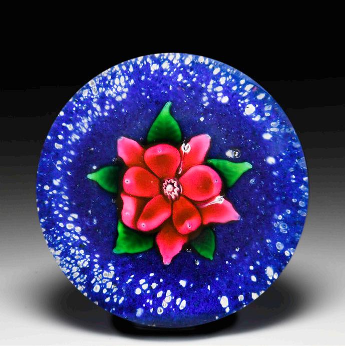 11 Rare antique Baccarat “thousand petal” red rose miniature paperweight. An expertly crafted multi-tiered garnet-red rose is crowned by six shaded green leaves as it blooms atop a curved stem, with two additional leaves, over a star-cut clear ground. Describing the rare Baccarat rose, Paul Hollister wrote, “The realistic features of these three-dimensional flowers are the way the petals remain closed in the center, suggesting a half-opened flower, and the lovely rose coloring, which ranges from softest pink to dusty velvet red.”
