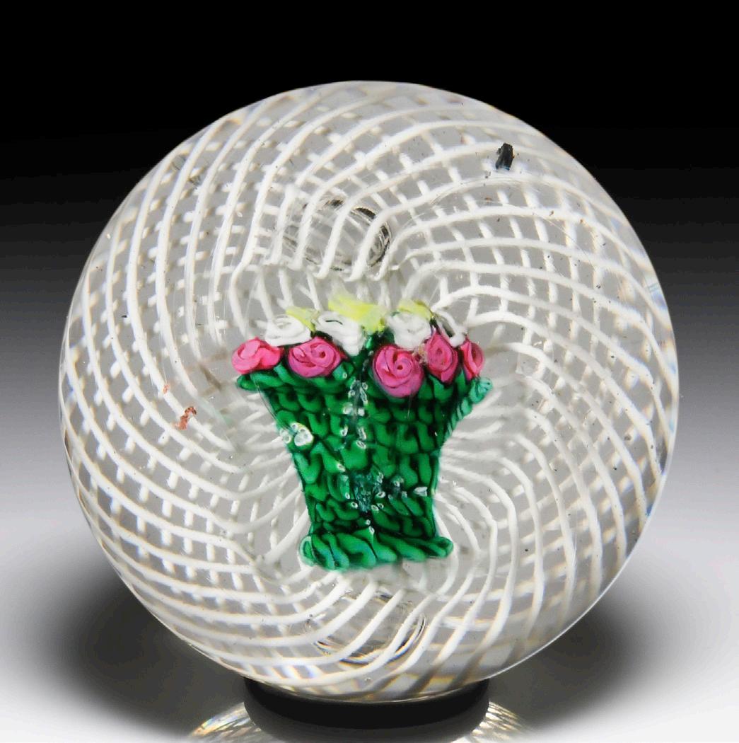 5 Very rare antique Sandwich Glass Company basket of pink and white roses paperweight. Probably created as a gift or a presentation piece, an unusual design depicts a bouquet of well-organized pink and white swirl roses, with a bit of yellow foliage, at the top of a dark green braided basket. Double-swirl white latticinio cushion. See The Art of the Paperweight: The Boston & Sandwich and New England Glass Companies, pages 144145, and Identifying Antique Paperweights: Lampwork, page 2 and plate 101.