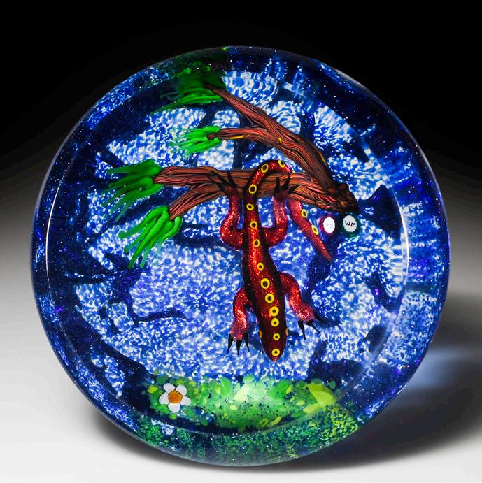 311 William Manson and John Deacons collaborative hanging lizard and tree textured paperweight. A red aventurine lizard, with yellow dorsal dots, hangs from a forking branch, with pine needles, above a patch of mossy earth with a white flower. Textured blue surface. Front display facet. Signature canes.