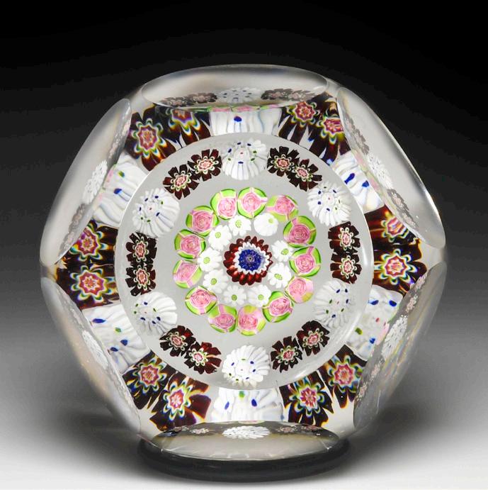 18 Antique Clichy cinquefoil millefiori garland with roses faceted paperweight. Iconic pink and green rose canes dot the voids of a star-shaped cinquefoil garland of dark purple pastry mold canes. A large green, white and pink complex cog cane centers the garland. A carefully positioned round facet appears over each lobe and a ring of smaller facets appears around the base. Top facet. Clear ground. Fine condition.