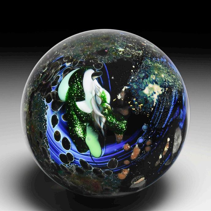 354 Jesse Taj 2002 “Butterfly” monarch murrina marble. A monarch butterfly murrina cane appears over a cobalt blue and white disc, surrounded by a blue and white torsade and a ring of white daisy flower canes, pressed in a surface of alternating swirls of green aventurine and sky blue. Spiraling dichroic gold and blue smoke interior. Signed/dated.