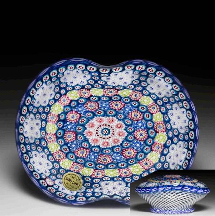 39 Antique Baccarat interlaced millefiori trefoil garlands paperweight. A trefoil garland of white and red stars and trefoils complex canes interlaces with a trefoil garland of white and blue stars and trefoils complex canes. Their center void is occupied by a ring of red cogs, surrounding a central red and white trefoil, quatrefoil and fortress complex cane. Clear ground. Excellent condition.