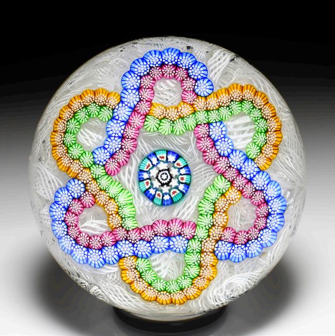 19 Antique Baccarat interlaced millefiori trefoil garlands paperweight. A small white cog complex cane is ring by the same canes, spaced by a ring of blue star canes, inside two interlaced garlands of contrasting millefiori, one in blue and the other in white and red. A white stardust and red bull’s-eye cane dots each loop of the garlands, in alternating with more iterations of the central cane. Clear ground.