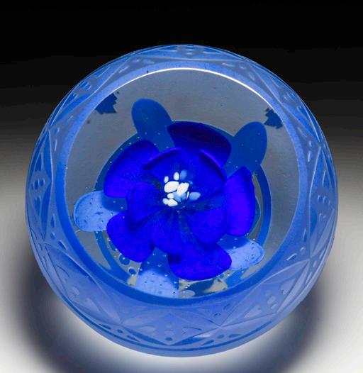 345 Caithness Glass (2004) “Floral Dream” blue flower overlay magnum faceted paperweight, by Helen MacDonald, from the Blue and White Treasures series. Two tiers of dark blue petals cup a central cluster of white and blue stamens and are cupped by five light blue sepals above a field of air bubbles to create a dewy entirely blue blossom. The flower emerges from a field of air bubbles from a clear ground, inside a frosted overlay, carved with a fancy floral vase design in light blue. Front viewing facet. Edition #48 of a limited edition of 100. Signed.