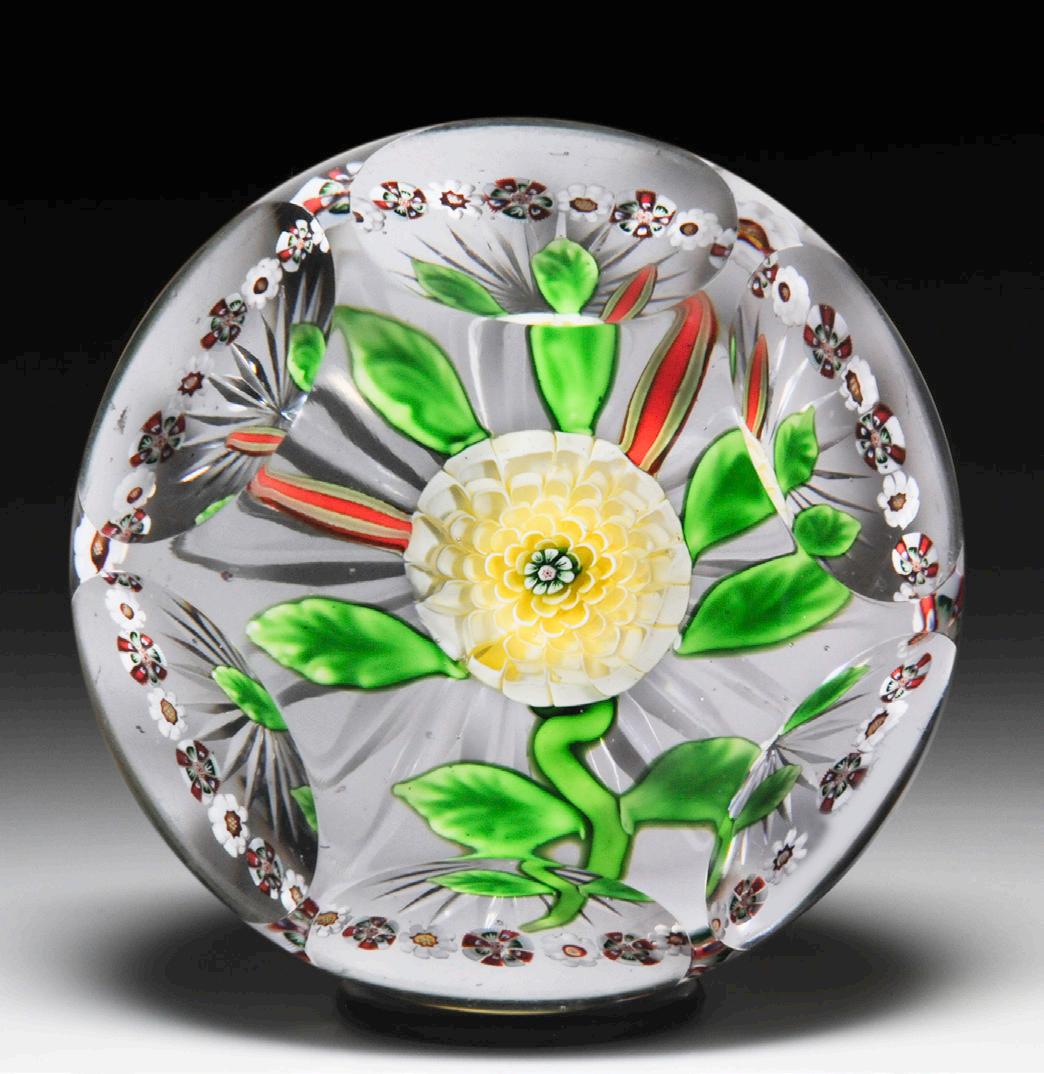 12 Antique Baccarat yellow pompon and millefiori garland faceted paperweight. Numerous tiers of thin C-shaped canes, in pale yellow, radiate around a central green arrowhead cane to form a delicate pompon blossom that grows from a green serpentine stem, with two opposing leaves, and is crowned with five leaves and two slender contrasting red buds. Green and red arrowhead canes alternating with red-centered white pastry mold canes form a border garland around the flower. Star-cut clear ground. Six side facets. For similar examples, see Glass Paperweights of the New-York Historical Society, page 60 and Glass Paperweights of the Bergstrom-Mahler Museum , page 40, figure 347. Fine condition.