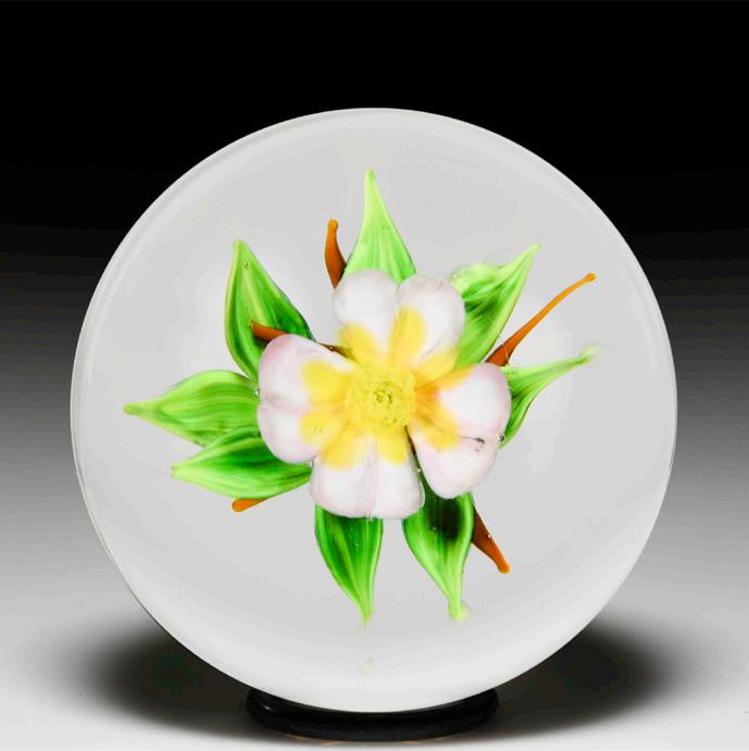 31 Antique Baccarat pink dogrose paperweight. A white and red stardust and bull’s-eye cane centers five notched double-tiered petals, each made of white-rimmed pink and cupped by a white second tier, to form a dogrose haloed by a crown of five green leaves and growing from a curved stem with two opposing branches of three leaves. Star-cut clear ground.