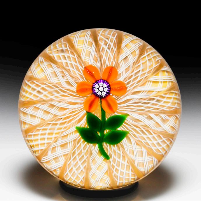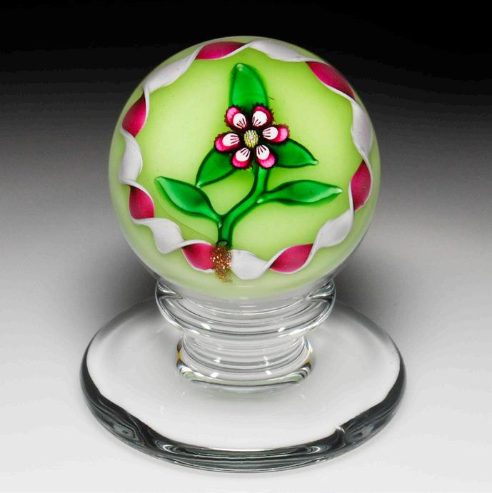 338 Perthshire Paperweights 1998 “Flower on Radials” crown paperweight. A central pink flower, with a complex cane center, is encircled by six sprigs of green leaves and rests on a translucent green crown cushion of white latticinio. Edition #198 of a limited edition of 250. Signature/date cane. Previously sold in the L.H. Selman Ltd. Summer 2014 57th Auction as lot 328.