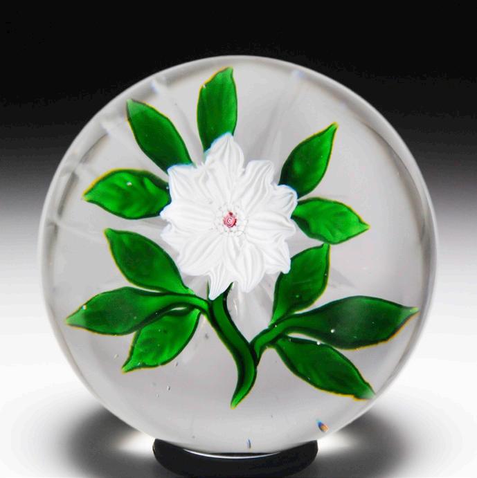 35 Antique Baccarat white double clematis paperweight. A double-tiered white clematis has a red bull’s-eye cane framed by two rings of white star canes at its nexus and sits atop a curving stem flanked by two trios of slightly crenulated green leaves. An additional five leaves crown the bloom which floats over a star-cut clear ground. Excellent condition.