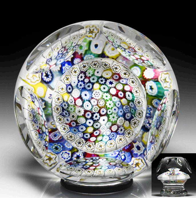 16 Antique Baccarat close packed millefiori mushroom with torsade paperweight. Varied complex millefiori, including large whorl, leaf, shamrock, star, cross, arrowhead, bundle, honeycomb, trefoil and quatrefoil canes, burst outward into a colorful mushroom cap. More canes trickle down the mushroom’s colorful stem, encircled by a well-formed blue-encased white torsade and one mercury ring. Star-cut clear ground.