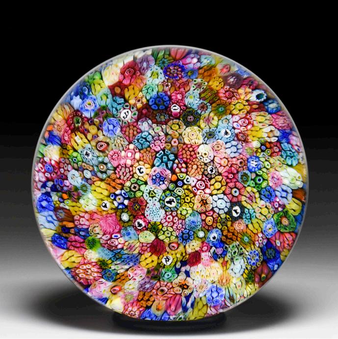 36 Antique Baccarat close packed millefiori paperweight. Assorted complex canes, including stars, cogs, arrowheads, honeycomb, shamrocks, leaves, whorls and bull’s-eyes, create a splash of red, white, green and blue above a hidden white lace cushion. Fine condition.
