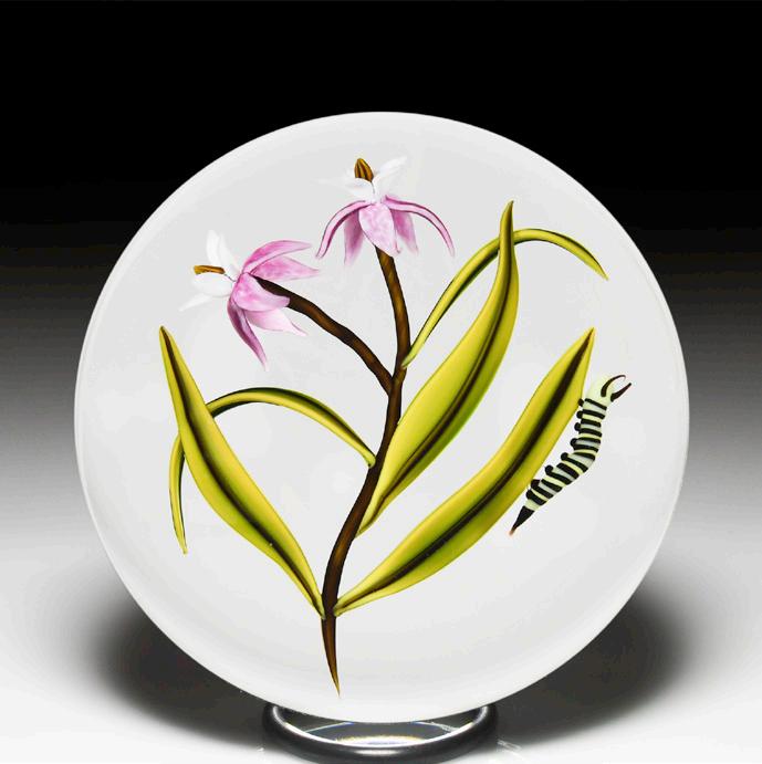 329 Perthshire Paperweights 1993 “Fuchsia” paperweight. A gracefully drooping fuchsia blossom, in pink and lavender, shares a long matrix stem with three pink buds and eight green leaves on a cushion of white upset muslin. Edition #101 of a limited edition of 300. Signature/date cane.