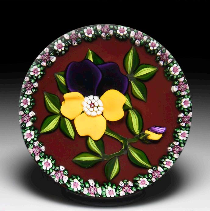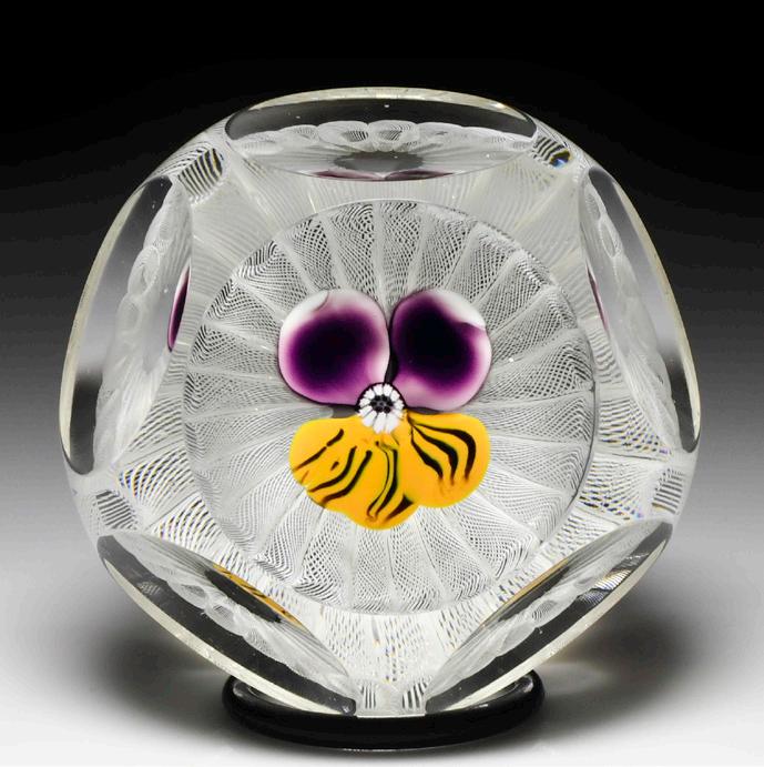 331 Perthshire Paperweights (1985) “Wild Pansies” and millefiori garlands faceted paperweight. Two purple and yellow wild pansies, with dark green leaves, rest on transparent blue ground, encircled by two concentric rings of complex canes. Top facet. Signature cane. Limited edition of 350; 337 made. Fine condition.