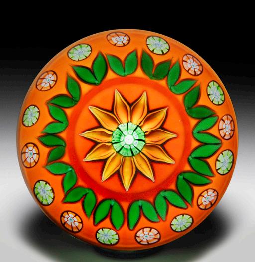 335 Perthshire Paperweights 1979 “Sunflower” paperweight. A large central orange and yellow sunflower, with eleven cupped petals and a green and white complex cane stamen, is ringed by a garland of alternating golden and green complex canes, each supported by two green leaves. Burnt-orange ground. Limited edition of 350; 303 made. Signature/date cane. Excellent condition.