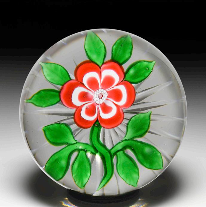 33 Antique Baccarat red and white primrose paperweight. A primrose flower has six red petals, each striped with arching white lines, radiating from a central white stardust and red bull’s-eye cane. It is crowned by five green leaves and grows from a curving stem, flanked by trios of leaves. Star-cut clear ground.