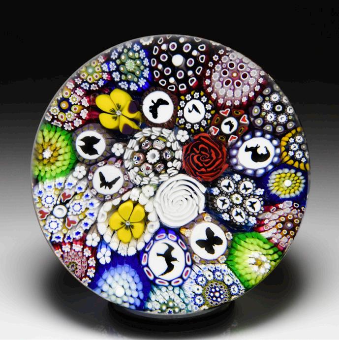 10 Antique Baccarat millefiori butterfly and garland paperweight. A deep amethyst latticinio butterfly is framed on either side by rainbow-colored millefiori fore and hind wings and garlanded by a ring of alternating green and white complex canes. Star-cut clear ground. “These insects dazzle the viewer, the delicate archetypes of a vibrant imagination. The millefiori garland forms a decorative frame of flowers around the colorful insect.”