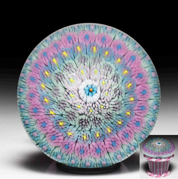 324 Perthshire Paperweights (2000) “Kissing Fish” pink fish and millefiori paperweight. A fish, composed of a yellow-striped dark pink body, with yellow latticinio tail and fins, is encircled by two concentric rings of pastel-colored complex canes, separated by a ring of alternating canes and twists. Opaque teal ground.