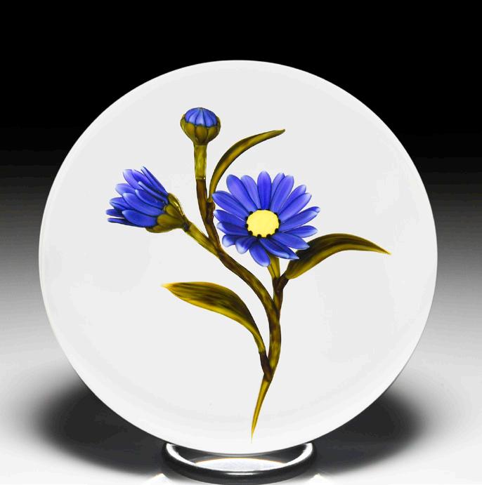 352 Caithness Glass (1983) “Flora” blue flower and millefiori garland faceted paperweight, by William Manson, from the Traditional Collection. A blue flower, with five scalloped petals around a yellow filament rod bundle center, has a crown of four leaves and blooms atop a short stem, flanked by two leaves. Dark translucent purple ground. Six and one facets. Edition #151 of a limited edition of 500; 165 made. Signed.