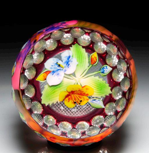 320 Perthshire Paperweights (1994) flower bouquet overlay faceted paperweight. Two small violas, one blue and white and the other orange and yellow, are joined by four companion buds splayed between the jagged edges of three ribbed green leaves. Grid-cut clear ground. Transparent red overlay, with geometric side faceting and one large top facet. Limited edition of 300; 214 made. Signed. Excellent condition.