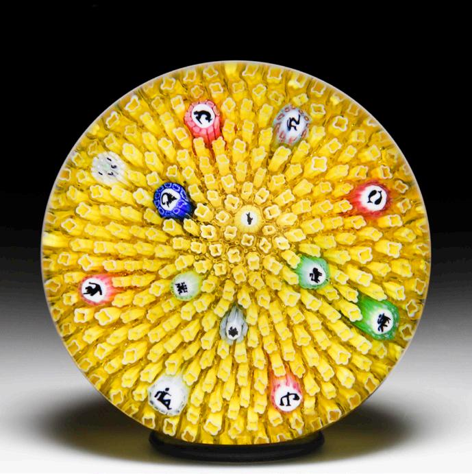 325 Perthshire Paperweights 1984 scattered millefiori and picture canes paperweight. A central signature/date cane, encircled by four spaced silhouette and picture canes and then a ring of eight complex canes, sits on a bed of white latticinio tubes, inside a cog border garland. Edition #52 of a limited edition of 250.