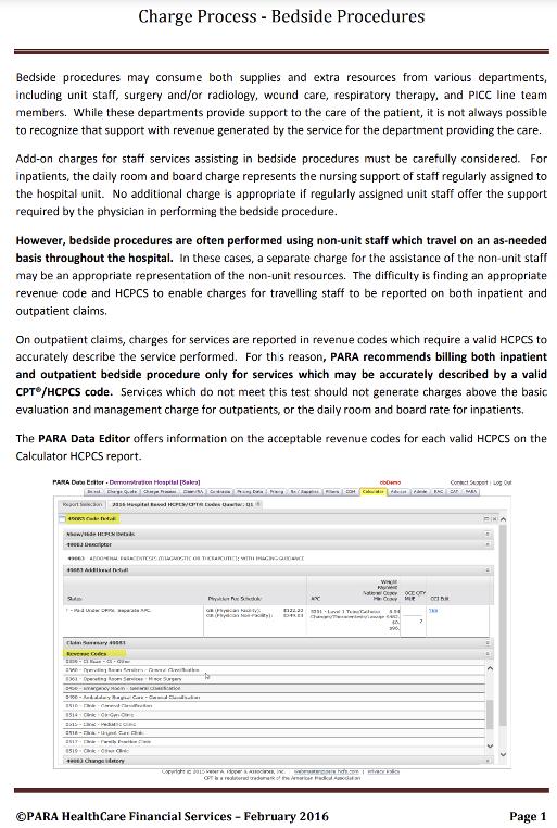 We refer to our Charge Process-Bedside Procedures paper. Services performed on an inpatient by regularly assigned unit nurses are generally considered part of the room and board daily charge That said, when the physician requires assistance with a bedside procedure from a facility staff who are not assigned to the unit, such as a respiratory therapist assisting with a bronchoscopy, the hospital may charge for the technical portion of the procedure. While HCPCScode 31622 describes the service, keep in mind HCPCScodes are not reported on inpatient claims, only the charges generated by the "traveling" staff member.