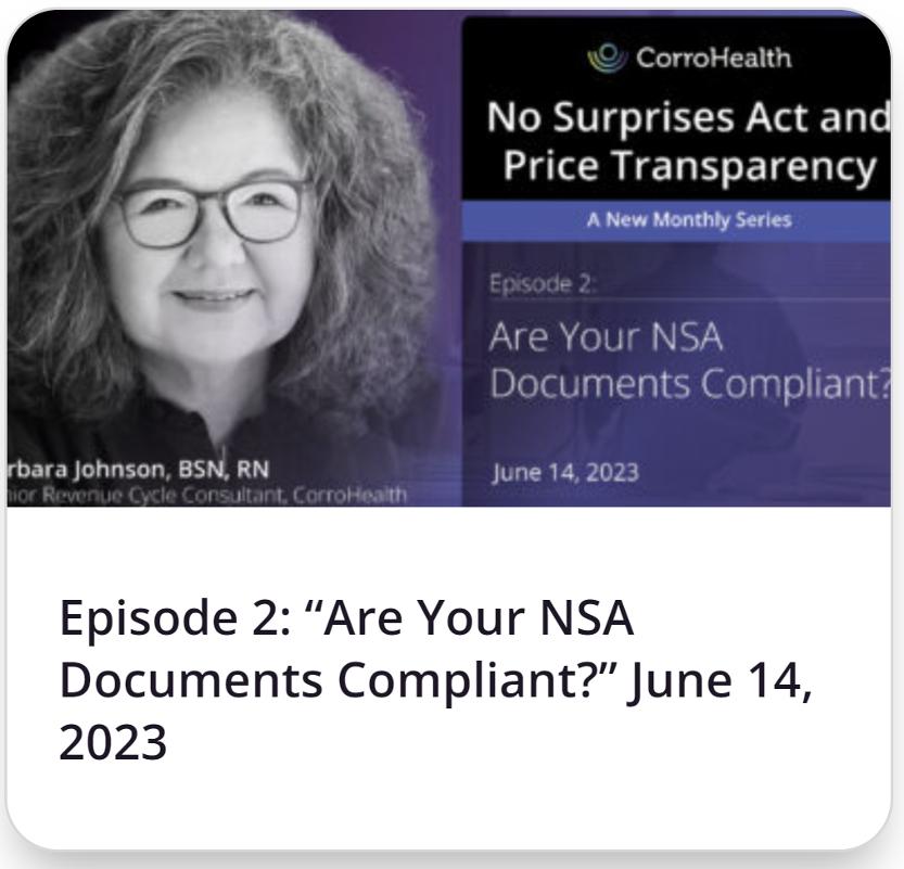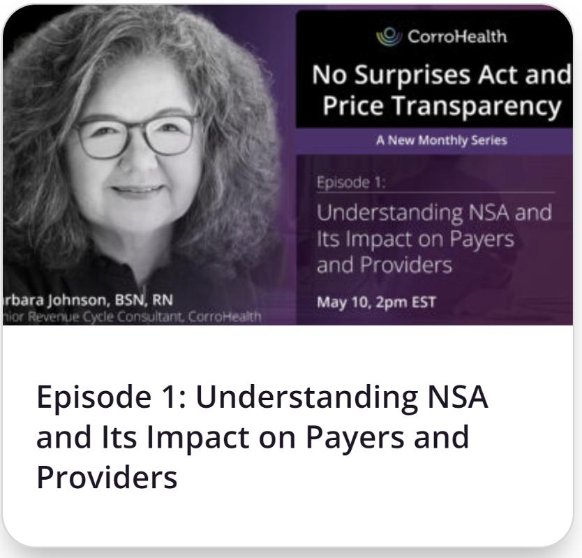 CorroHealth?s ?No Surprises Act and Price Transparency, a New Monthly Series?was created to provide attendees with clarity around No Surprises Act, to answer questions, and get you on the best path for success. The series also clarifies payers?increased role in the process, the status of impactful legislation, and the processes providers should follow to comply