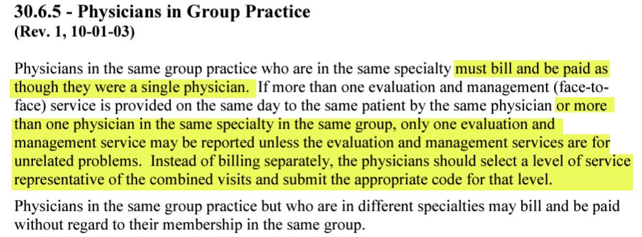 This also applies when billing professional fees for E/M services rendered in the CAH setting and billed on an 851 TOB. If the physicians are in different specialties (but within the same group), they may bill and be paid separately for their services