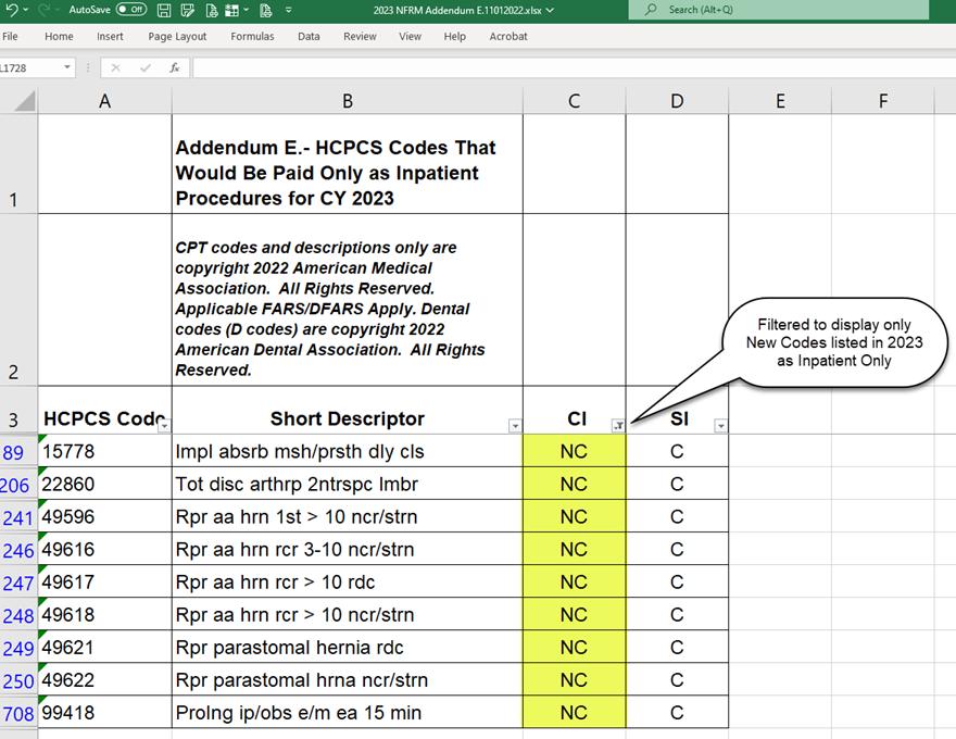 The nine newly added Inpatient Only HCPCSprocedures are identified with the letters ?NC?in the column labeled ?N?(Change Indicator) as shown below: