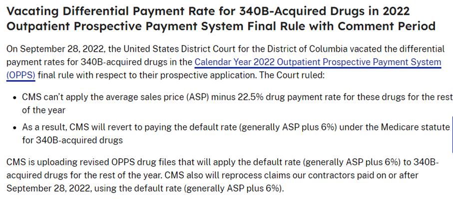 On June 15, 2022, the Supreme Court of the United States (SCOTUS) issued a decision that Medicare improperly reduced OPPSreimbursement to certain hospitals which purchase drugs under HRSA?s 340B program in 2018 and 2019 The full text of the court?s decision is available at https://www supremecourt gov/opinions/21pdf/20-1114 09m1 pdf )