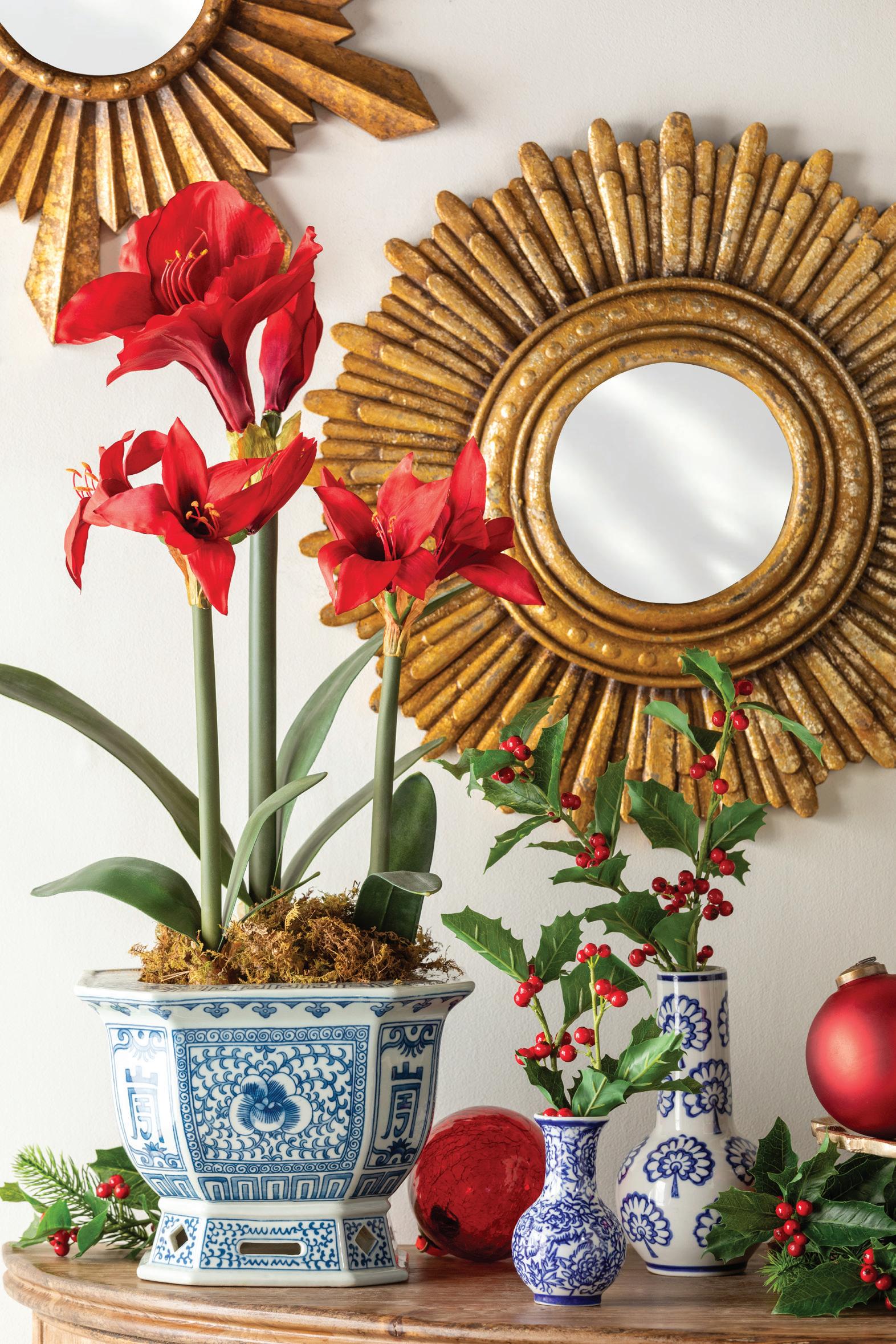 PORCELAIN STAFFORDSHIRE DOGS FIGURINES, 2 ASSORTED STYLES: XAB40485, SCALLOPED EDGE CAST ALUMINUM CAKE PLATE, 11 IN.: EAW30164, LAVEZZI SUNBURST MIRROR: EWI36070, AMARYLLIS IN BULB POT, RED: XBQ10123, STAR AMARYLLIS IN BULB POT, RED: XBQ10127, CHINOISERIE SQUARE PLANTER: ECL36202, MARSEILLE SUNBURST MIRROR: EWI36072, PORCELAIN VINE PETITE VASE, 3 ASSORTED STYLES: ECL36211, PORCELAIN BUD VASE: ECL36168, ENGLISH HOLLY STEM: XBY80019
