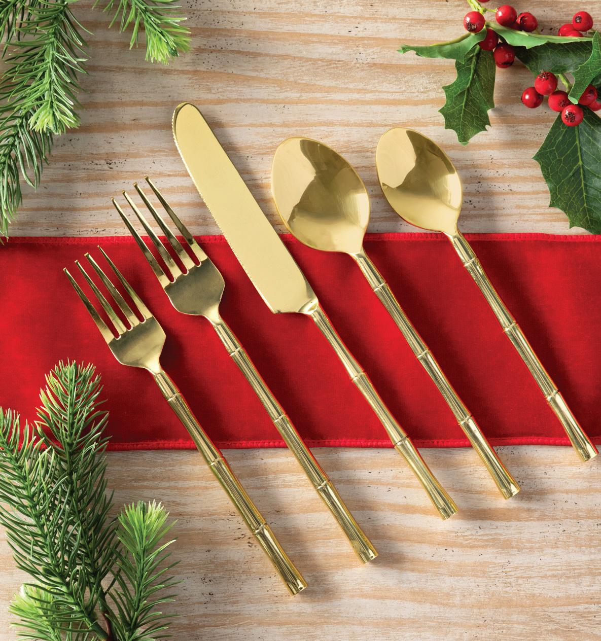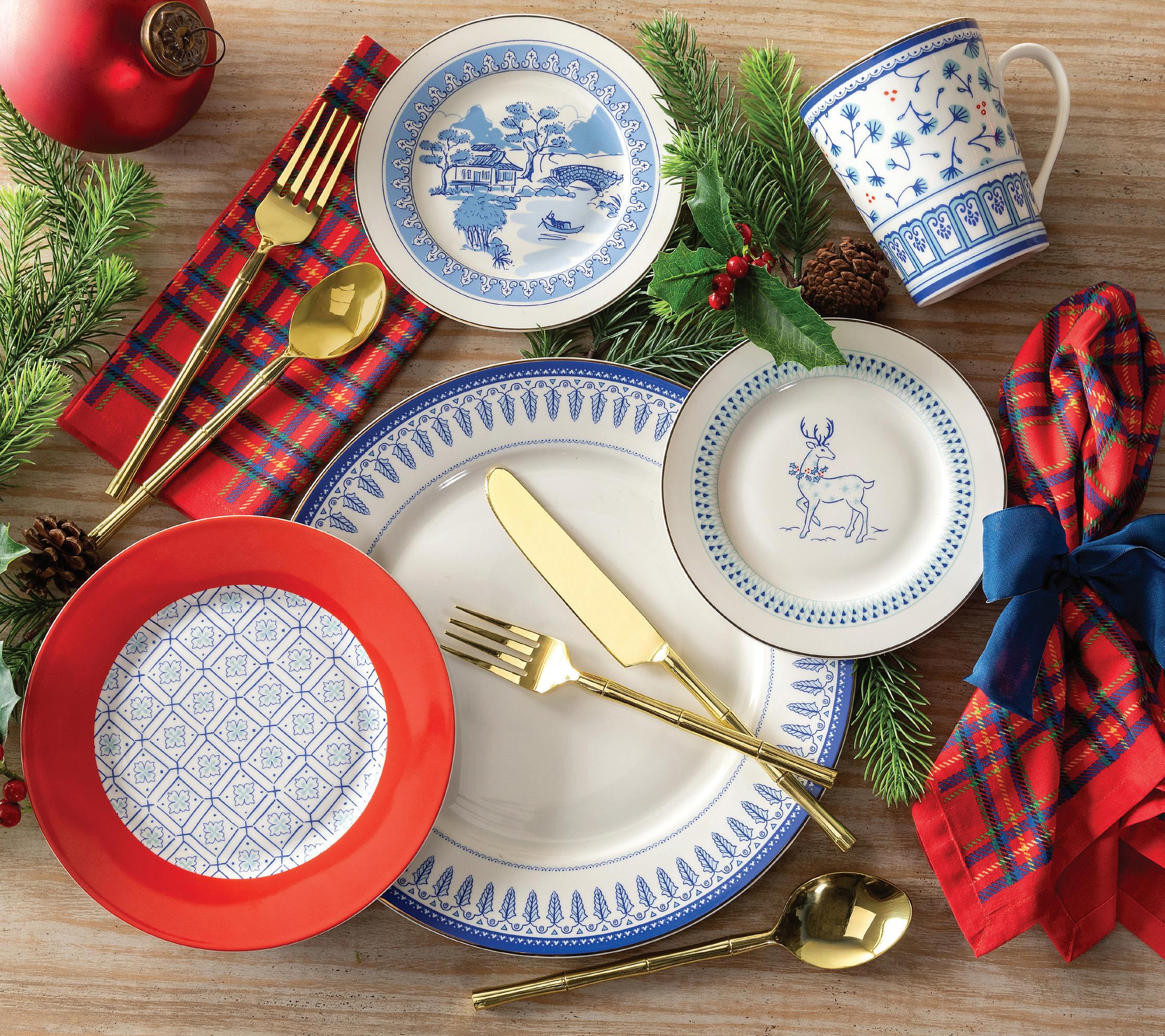 TOILE CHINOISERIE PATTERN SERVING PLATTER: XAW40281, CHINOISERIE PATTERN MUG, 4 ASSORTED STYLES: XAW40286, CHINOISERIE PATTERN BOWL, 4 ASSORTED STYLES: XAW40285, BAMBOO MOTIF GOLD FLATWARE, BOXED SET OF 5: EAW40269, CHINOISERIE CHRISTMAS DINNER NAPKIN: XAW40439