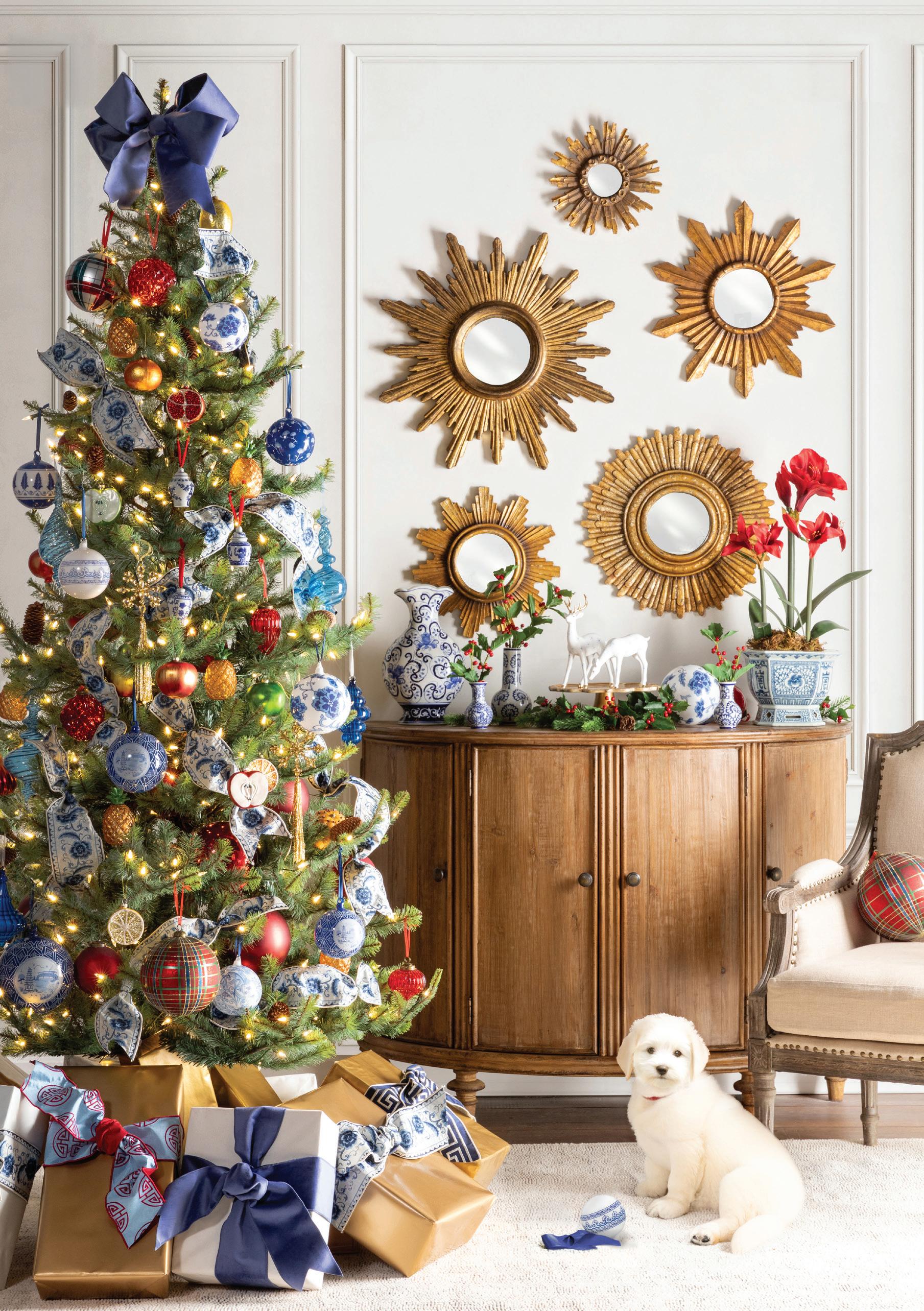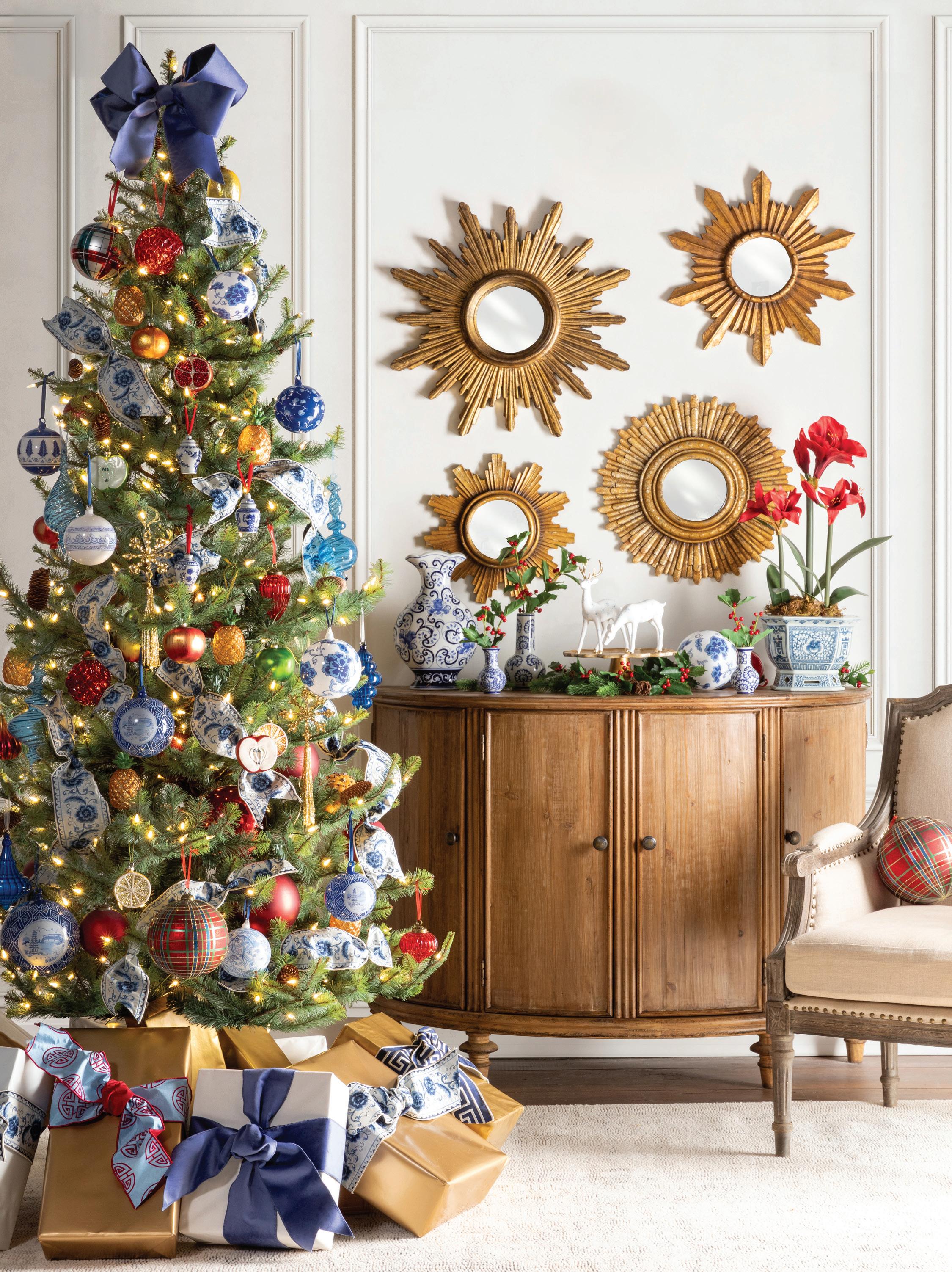 PARK HILL BLUE SPRUCE SLIM CHRISTMAS TREE, 7.5’: XPQ82170, VELVET TAFFETA BACK CADET BLUE RIBBON: XXO40305, CHINOISERIE PEONY RIBBON: XXO40302, CHINOISERIE RED-PALE BLUE POSPERITY RIBBON: XXO40301, GREEK KEY EMBROIDERED PATTERN RIBBON: XXO40300, CORSICA SUNBURST MIRROR: EWI36188, ISOLDE SUNBURST MIRROR: EWI16001, LAVEZZI SUNBURST MIRROR: EWI36070, MARTINIQUE SUNBURST MIRROR: EWI36069, MARSEILLE SUNBURST MIRROR: EWI36072, CHINOISERIE CLASSIC VASE: ECL36200, PEONY PATTERN GLASS BALL ORNAMENT, 6”: XAO40353, ALEXANDRA DEMILUNE CABINET: EFC36163, SIMONE UPHOLSTERED ARM CHAIR: EFS06072