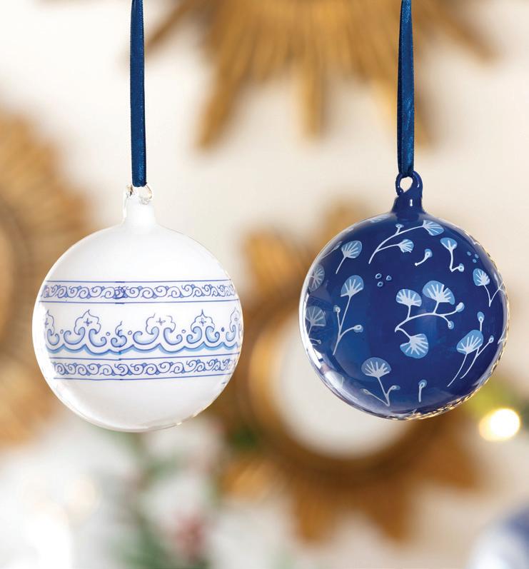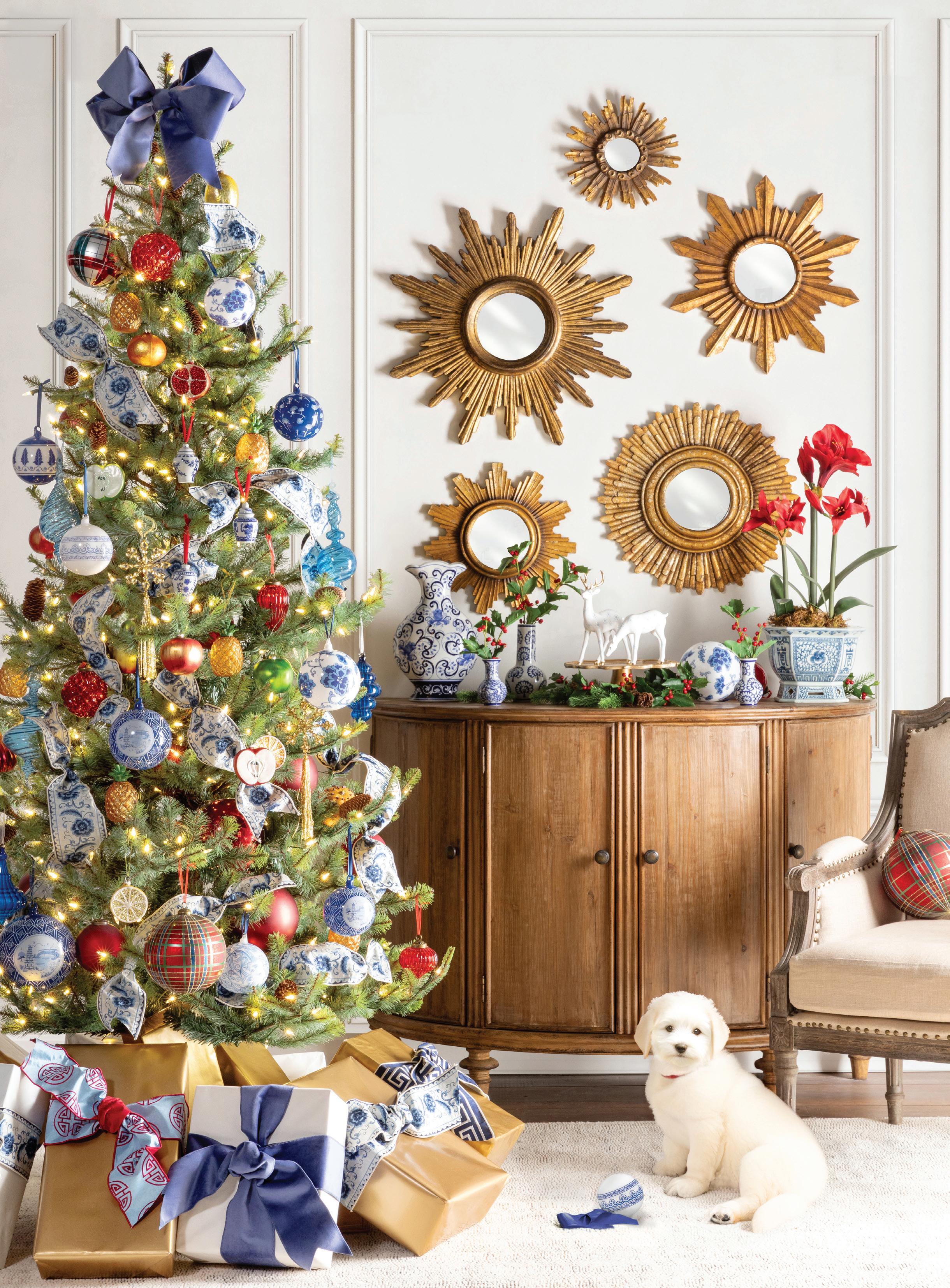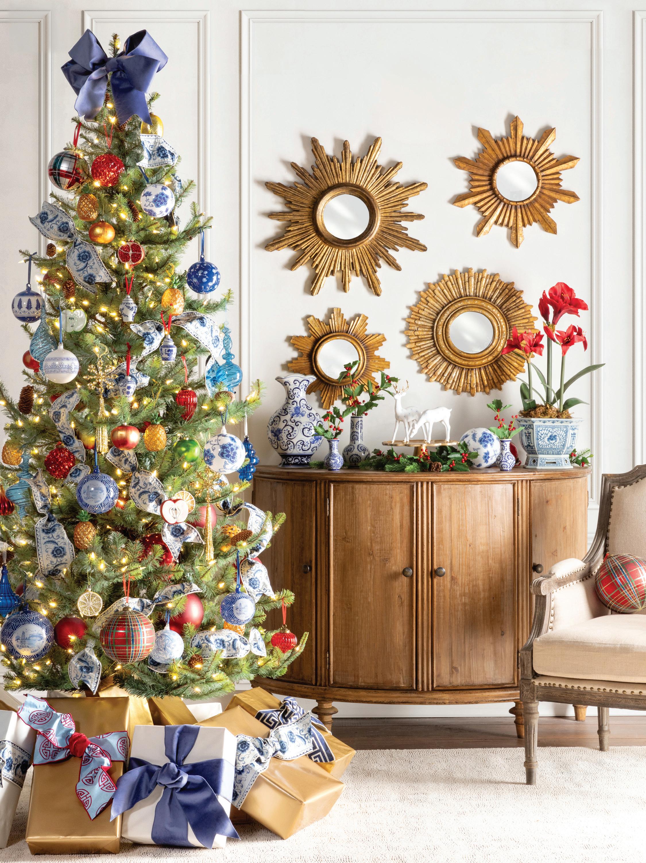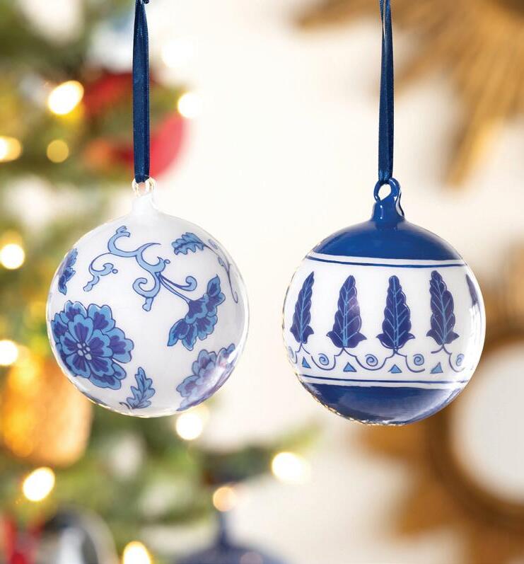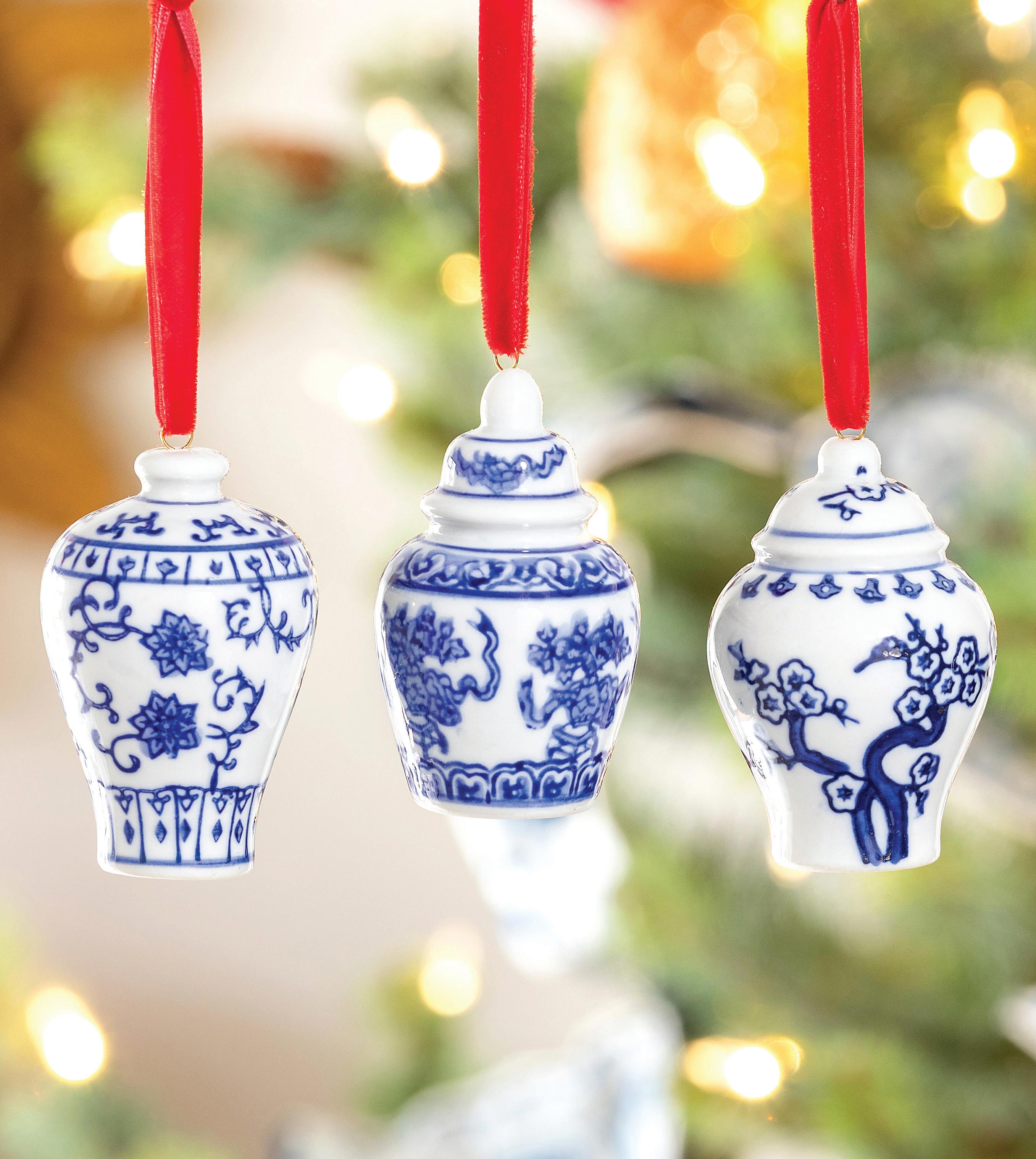 Traditional chinoiserie ornaments create a beautiful blue and white tree. Adding a touch of red through shimmery ornaments or textural ribbon will complete the look.