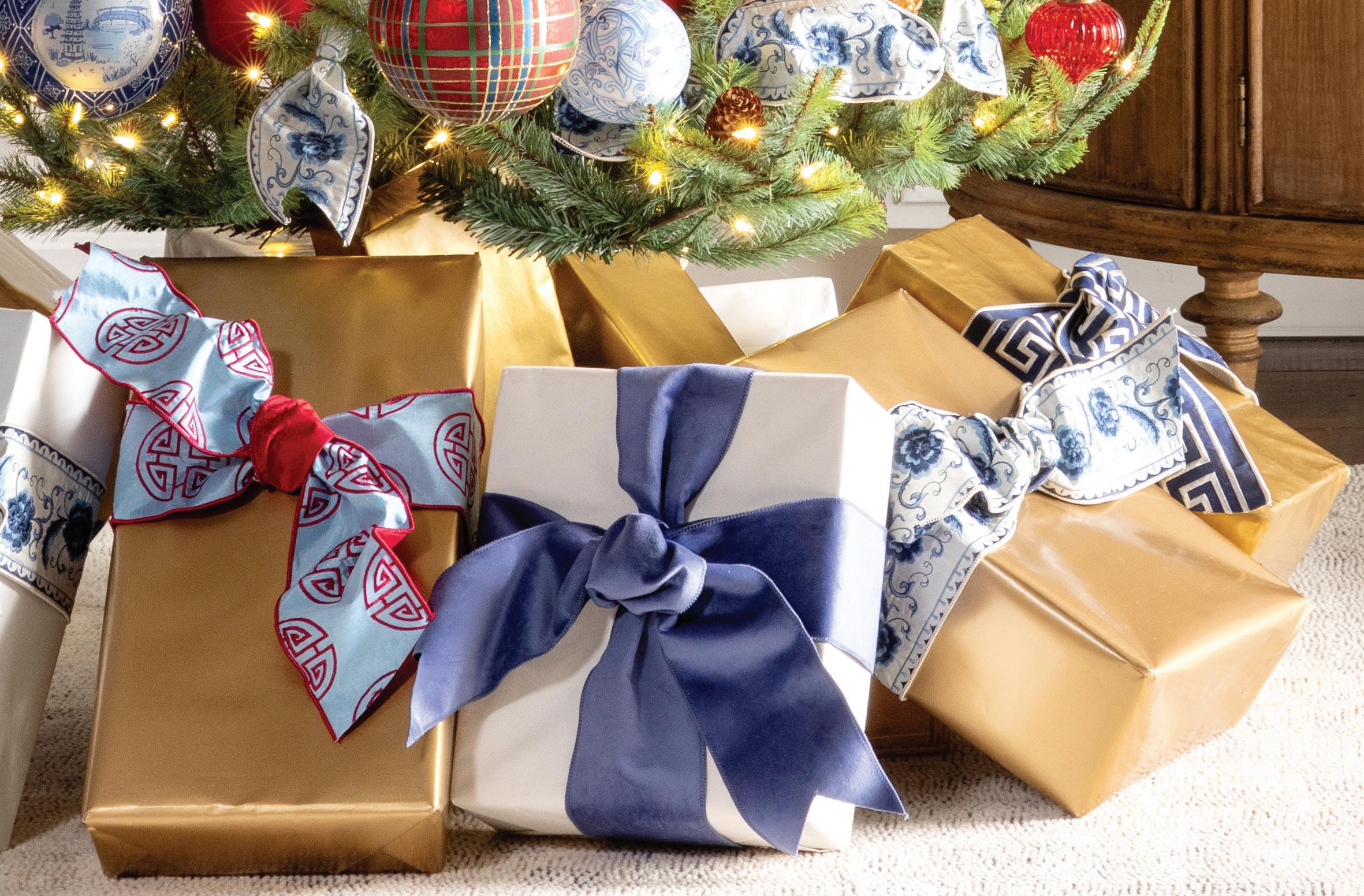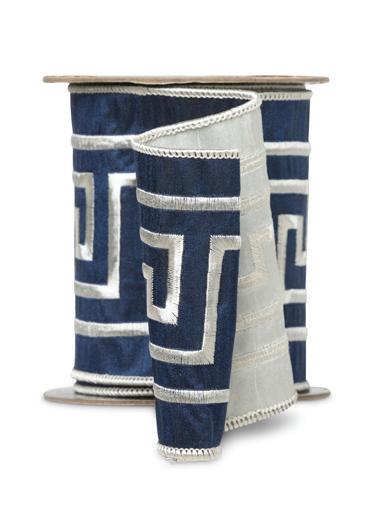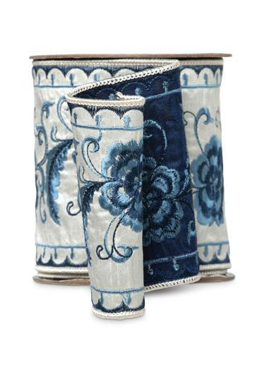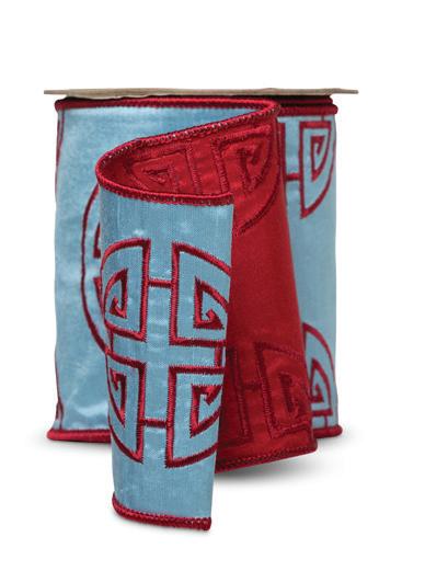 VELVET TAFFETA BACK CADET BLUE RIBBON: XXO40305, CHINOISERIE RED-PALE BLUE POSPERITY RIBBON: XXO40301, CHINOISERIE PEONY RIBBON: XXO40302, GREEK KEY EMBROIDERED PATTERN RIBBON: XXO40300, CHINOISERIE PLAID RIBBON: XXO40316