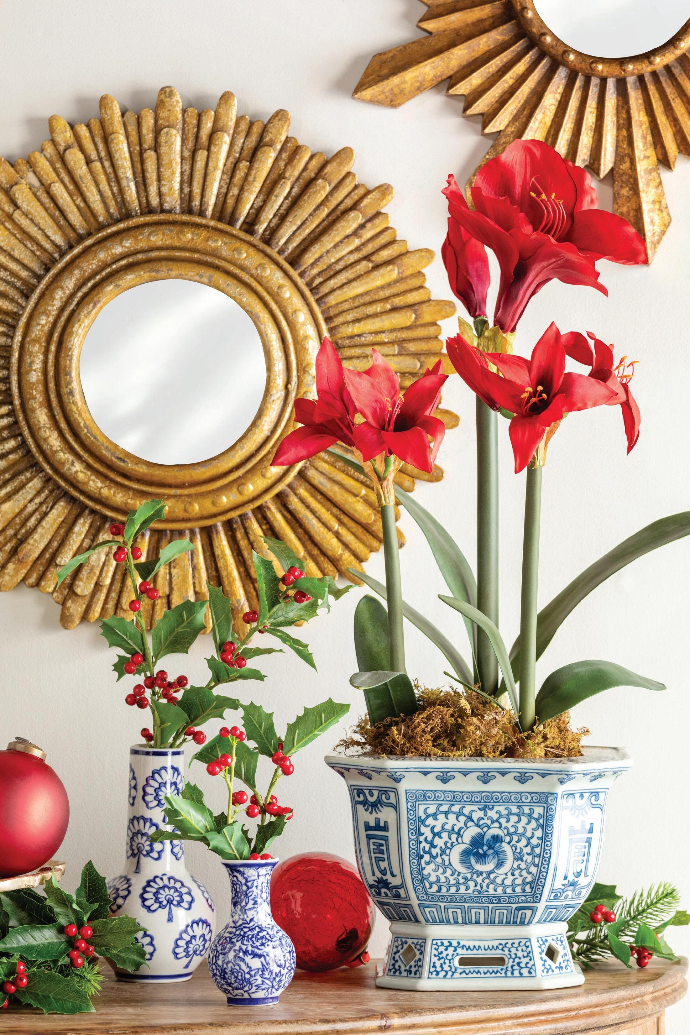 CHINOISERIE GINGER JAR ORNAMENT, 3 ASSORTED STYLES: XAO40460, LAVEZZI SUNBURST MIRROR: EWI36070, AMARYLLIS IN BULB POT, RED: XBQ10123, STAR AMARYLLIS IN BULB POT, RED: XBQ10127, CHINOISERIE SQUARE PLANTER: ECL36202, MARSEILLE SUNBURST MIRROR: EWI36072, PORCELAIN VINE PETITE VASE, 3 ASSORTED STYLES: ECL36211, PORCELAIN BUD VASE: ECL36168, ENGLISH HOLLY STEM: XBY80019