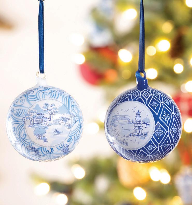 Exclusive artwork by local artist, Amy Gatewood, gives an updated appeal to classic chinoiserie style in hand blown glass ornaments and tableware.
