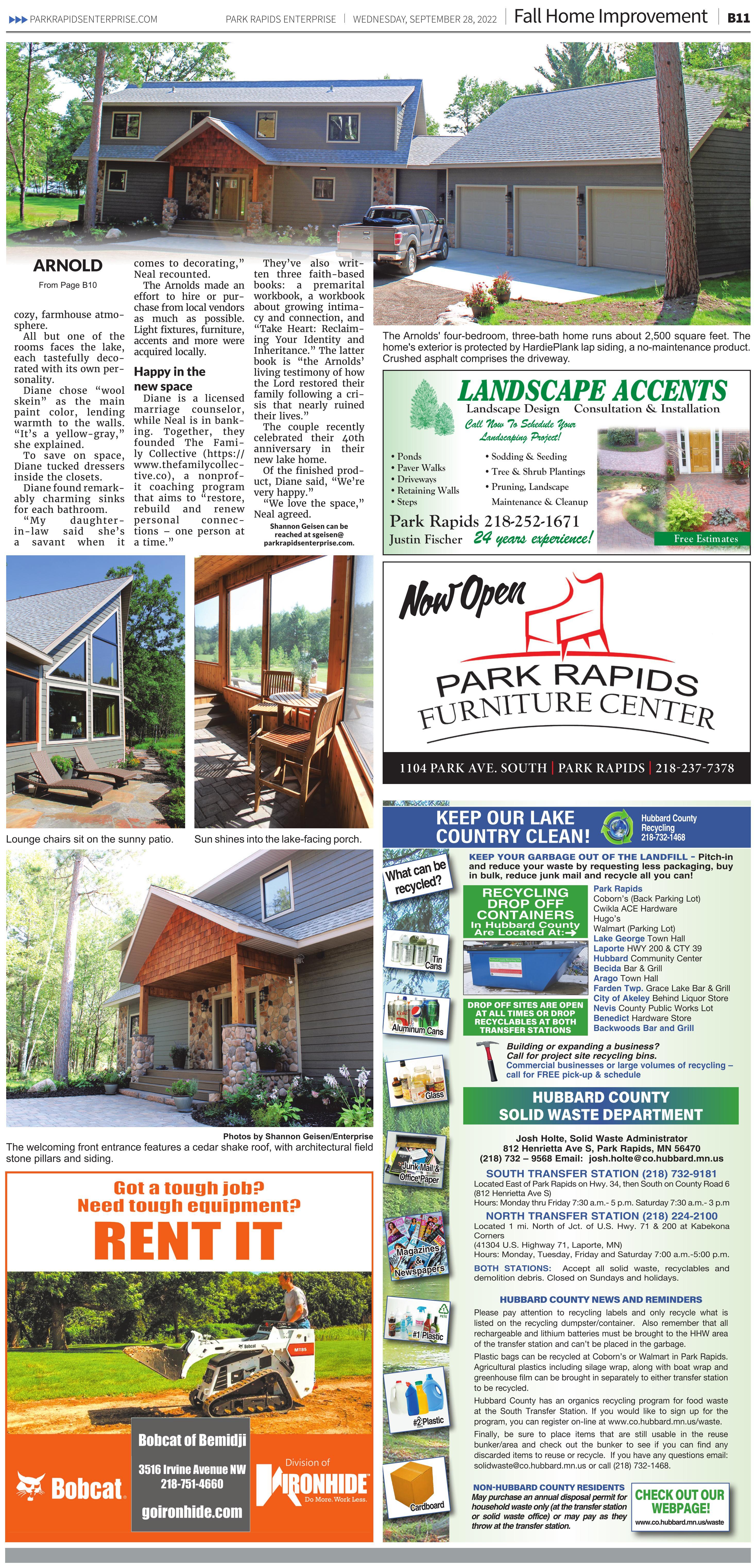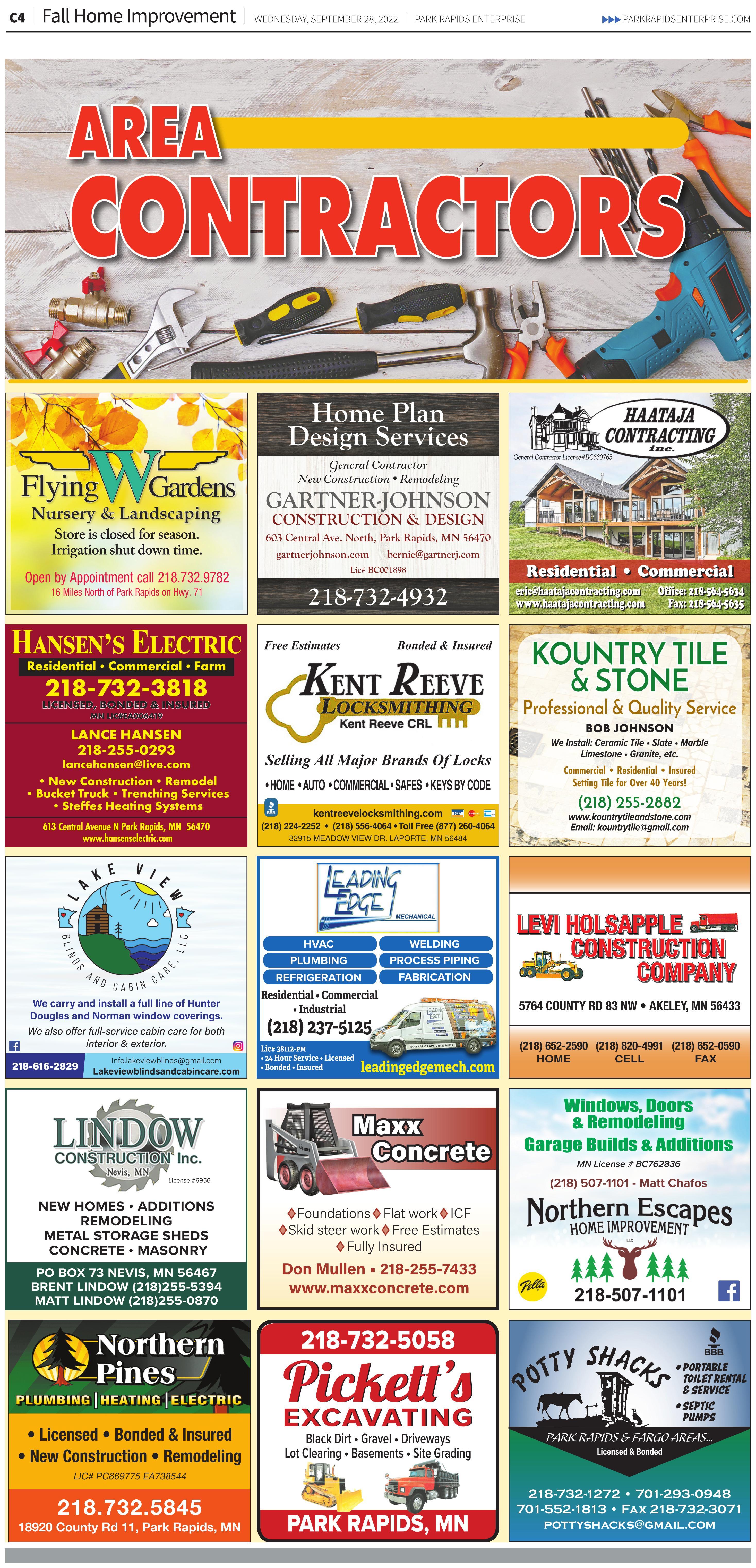 B8 | Fall Home Improvement | WEDNESDAY, SEPTEMBER 28, 2022 | PARK RAPIDS ENTERPRISE PARKRAPIDSENTERPRISE.COM Friendly service, old fashioned courtesy, and the highest attention to detail for your new construction or remodeling. KITCHEN • BATHROOMS • FIRE PLACES • BARS 16 West Birch St, Motley, Minnesota 56466 brichacekstone@brainerd.net brickacekstoneinc.com (218) 352-6061 Contact Us (800) 492-4833 525 Roosevelt Ave Detroit Lakes, MN 56501 www.dynamichomes.com • All program orders will be locked in 2022 pricing. • Get an early start on the 2023 build season. 2022/2023 Winter Promotionfor houses to be set in 2023. 2022 Winter Promotion $3/ft2 incentive effective September 12th - October 30th $2/ft² incentive effective October 31st - November 30th $1/ft² incentive effective December 1st - December 30th Choose a plan from our Portfolio of established plans and a full array of options or bring in your own plans for a custom design. (218) 652-5296 Serving Akeley, Nevis, Park Rapids, Walker and surrounding areas. • Weekly Lawn Maintenance • Sprinkler Systems Installation • Sprinkler System Maintenance • Hydroseeding • Landscaping • Fertilizing/ Weed Control • Dirt Work • Snow Removal • Landscape Design www.sunshinelawnandlandscape.com