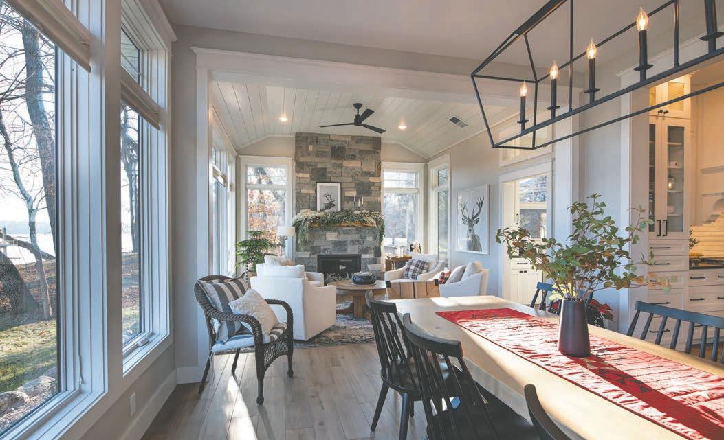 Incorporating a screened-in porch was a top priority. They love the 18-by-14-foot, bug-free zone, plus ceiling fan. Tall windows overlook a bay of Lower Bottle Lake.