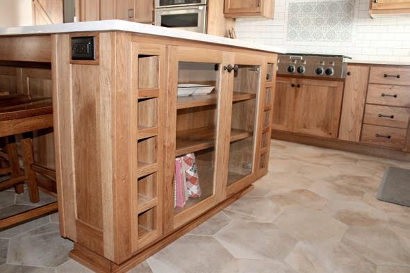 An adult beverage cooler is housed in one corner of the island. The other end features glass cabinets, perfect for storing cookbooks, special glassware and other knick knacks.