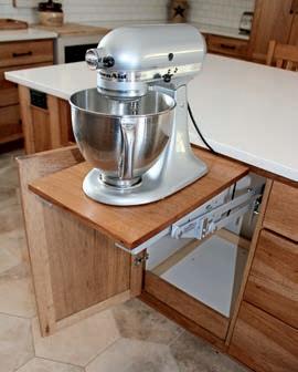 Her KitchenAid mixer has its own cabinet with a shelf that can be lifted and locked into place.