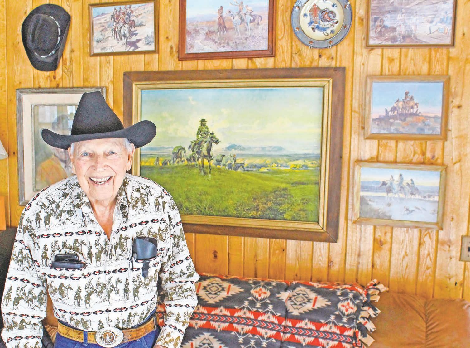 "People don't know me without my hat," says Jim Larson, pictured in front of a wall of Western-style art at the home he built by hand in rural Nevis.