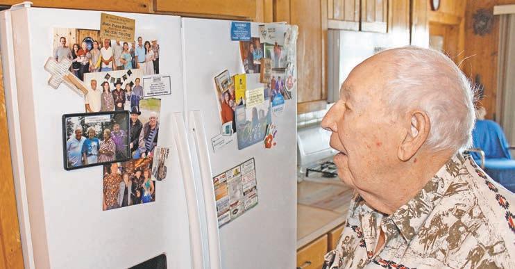 Jim Larson pauses for a moment to look at pictures of his two sons and two daughters. He also has 10 grandchildren, 20 great-grandchildren and one greatgreat-grandchild.