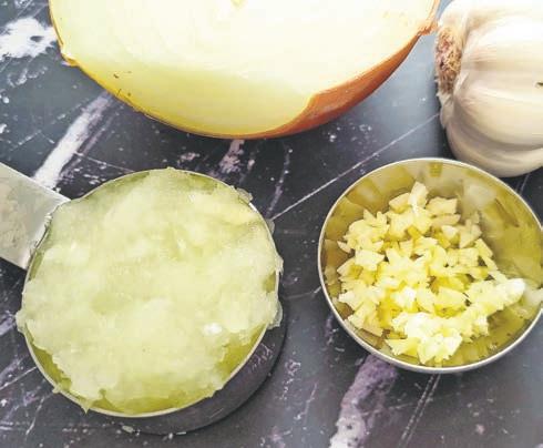In a medium frying pan, heat the olive oil over medium heat. Add the grated onion and cook on medium-low heat, stirring frequently, until the edges just start to brown, about 2 minutes. Stir in the garlic and crushed red peppers. Continue to cook over medium-low, stirring often, until fragrant but not browned, about 2 minutes.