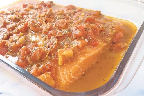 heat for 2 minutes, stirring often. Add the diced tomatoes and increase to medium heat. Stir to combine and cook for 5 minutes, stirring occasionally. Add the chicken stock and lemon juice and bring to a boil over medium-high heat. Reduce to low and add the thyme and basil. Simmer gently over low heat for 5 minutes, stirring occasionally. Remove from heat and discard the herb sprigs, if using fresh herbs. Pour the mixture over the side of the salmon and bake in the center of the oven, until the salmon is fully cooked and opaque on the inside, about 18 to 20 minutes. You can insert a meat thermometer into the thickest part of the salmon to ensure that it has an internal temperature of at least 145 degrees.