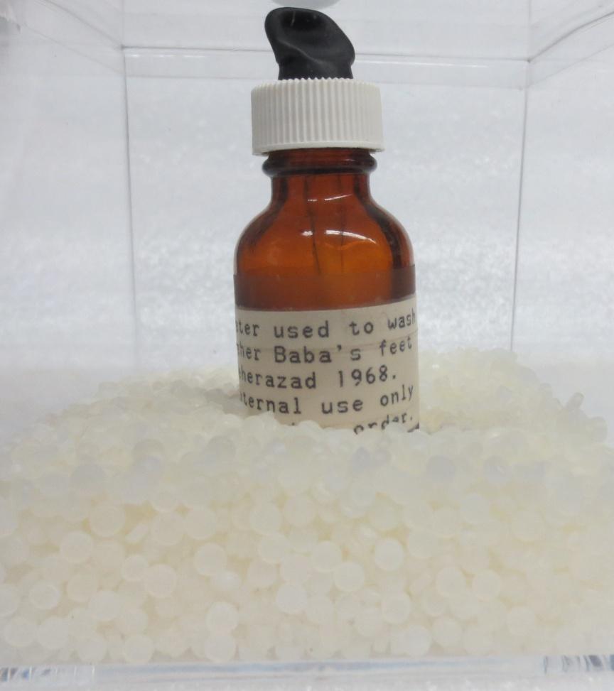 SN5 Plastic medicine bottle “Tri-Aminosorb” contains: two tiny vials wrapped in soft paper, looking like little rolls. Also inside a note in Erico Nadel’s handwriting: “2 small vials of water blessed by Baba & given to Keshav Nigam in Oct. ’68. If they break (fragile) tell me and I’ll send more.”